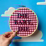 Made in a 6 inch hoop on a red and white cotton gingham fabric background.